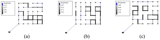 Figure 5 shows the variance in pipe diameters at each pipe of the final solutions for different layouts with different sets of BIs and MCs. A high diameter variation (thick pipes in Figure 5) was identified at downstream looped pipes, while transmission lines near the source had low diameter variations. Considering the large diameter (and high cost) of transmission lines, this small variation indicates that local looped pipes have a significant influence on the total system’s ODL.