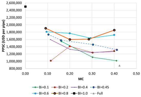 Per pipe system cost (PPSC) and MC values of the 25 networks grouped by BI values.