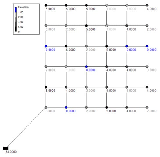 The impact of nodal elevation heterogeneity on the ODL was investigated. Three elevation distribution cases were generated with the four selected layouts: plane elevation (Case 1), consistently increasing elevation (Case 2), and random elevation (Case 3). The nodal elevation was 0 m at all nodes in Case 1. In Case 2, the elevation increased incrementally from 0 m at the node immediately downstream of the single source, to 6 m at the node in the northeastern corner of the network (Figure 2). In Case 3, nodal elevations were randomly selected among the integers of 0–6 (Figure 7).