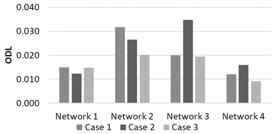 ODLs of four selected networks in three nodal elevation cases: plane elevation (Case 1), consistently increasing elevation (Case 2), and random elevation (Case 3). Network 1 with a pipe at all links (full network), Network 2 of BI = 0.2 and MC = 0.3, Network 3 of BI = 0.81 and MC = 0.29, and Network 4 of BI = 1.0 and MC = 0.