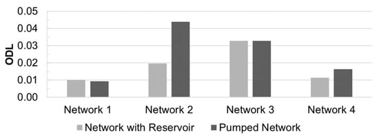 Figure 9 shows the ODL values obtained under the gravity-fed and pumped water supply conditions. While the ODL of the pumped system was greater than or almost equal to that of the fixed-head system (Figure 9), the highest ODL was observed for a dense network—Network 2 with a pump station (BI = 0.2 and MC = 0.3). The ODL was lowest for Network 1, which had full pipe density and the lowest branchedness.