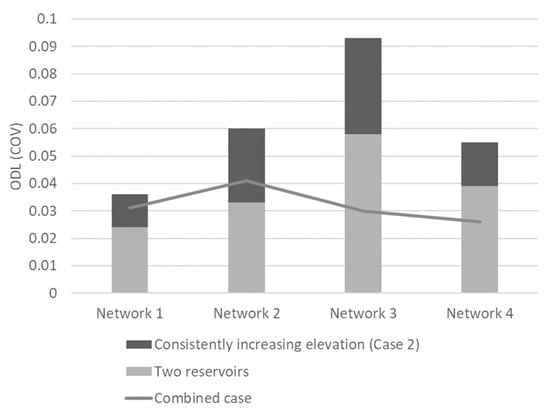 Figure 10 shows the ODL values of the final solutions for the four networks (Networks 1–4) with two reservoirs and consistently increasing elevation obtained from 30 independent optimization runs. Contrary to expectations, the ODLs were lower in the combined case than the sum of the ODLs in the network with individual changes (Figure 10). The gap between the two ODLs was highest for Network 3 with BI = 0.81 and MC = 0.29. For the branched networks (Networks 3 and 4), the ODL of the combined case was even lower than that of the network with two reservoirs. This confirms that the ODL cannot be computed according to the principle of superposition, and thus cannot be easily anticipated a priori. The system-wide hydraulic complexity determines the overall ODL. Therefore, preliminary optimization test runs should be performed with the proposed ODL indicator and two-phase examination framework to confirm the ODL of the problem of interest.