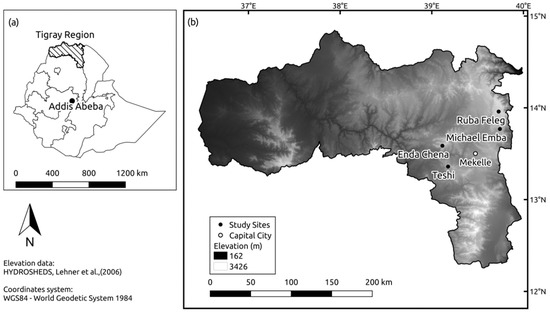 Study area: (a) Location of Tigray Region in Ethiopia; (b) location of study sites within Tigray Region. Elevation data from [47].
