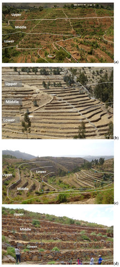 Location of soil sampling sites at the upper, middle, and lower positions of the four hillside farming sites: (a) Teshi, (b) Ruba Feleg, (c) Michael Emba, and (d) Enda Chena.