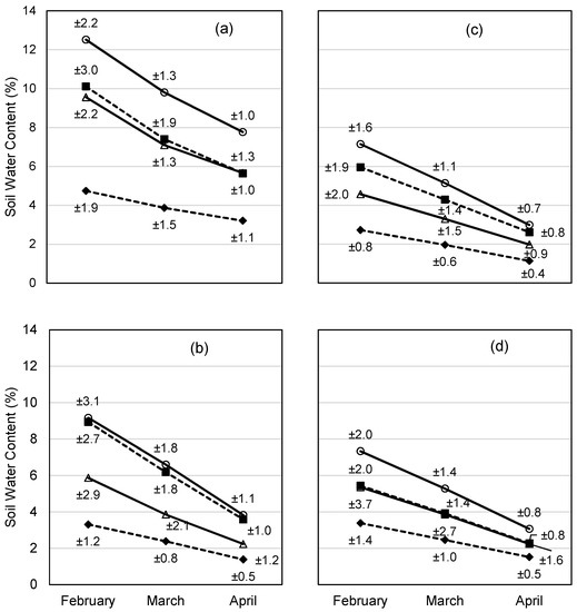 Soil water content (SWC) on the four sites: (a) Teshi; (b) Ruba Feleg; (c) Michael Emba; and (d) Enda Chena. The numbers close to the points indicate the standard deviation.