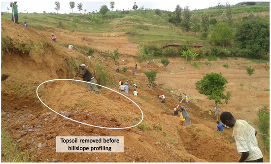 Practice of removing the topsoil and putting it apart before hillslope profiling during terraces implementation, according to Bekele-Tesemma, 2011 [22], Rwanda, photo of G. Castelli, 2017.