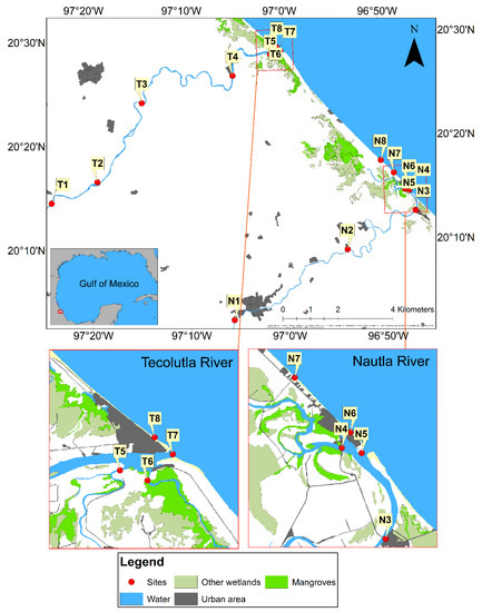 The coastal area is covered by wetlands, including mangroves. A large area of mangroves has been lost in the last decades, mainly due to agriculture and cattle ranching [36] or to disturbances from hurricanes [35]. Urban wastewater does not undergo any treatment before the discharge into natural systems and industrial waste, such as fruit juice companies, discharge their waste into the rivers [35]. In order to study the source of nitrogen to mangrove areas and to the coast through the Tecolutla and Nautla rivers, 6 and 4 monitoring sites were selected along each river respectively. An additional site was located in each river mouth. One coastal site was placed ~1 km from the Tecolutla river mouth and three sites ~1 km, ~4 km and ~7 km from the Nautla river mouth, respectively. The study area is presented in Figure 1 and the monitoring sites in Table 1, together with the distance to the coast and the mean salinity. The later was calculated with four measurements from 2016.
