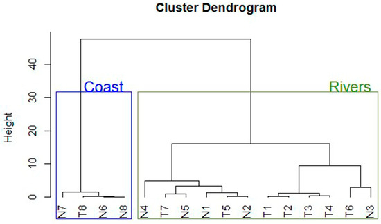 Firstly, spatial variations in nitrogen species concentrations were identified. As water quality data do not usually meet the requirements for the use of parametric statistics [38], non-parametric methods were selected. Cluster analysis (CA) is a non-parametric multivariate statistical method which groups objects in clusters based on similarities among objects of the same group and differences within the groups. The clusters obtained are consequently groups of observations with similar characteristics. In this study, CA was used to classify the monitoring sites (objects) into groups of different nitrogen concentration levels (clusters). Ward’s method was used as a clustering strategy as it has been defined as the most appropriate method to evaluate eutrophication [38,39]. The squared Euclidean distance was selected as the distance measure to increase the importance of large distances among the monitoring sites [40]. Three variables were used for classification: ammonium, nitrate and organic N concentrations. The outliers are not discarded as they carry information related to the ecosystem’s stress [38]. Using the median of each monitoring site was more robust due to the presence of outliers. Each variable was standardized prior to CA implementation. Two groups (clusters) were defined which correspond to coastal and riverine samples.