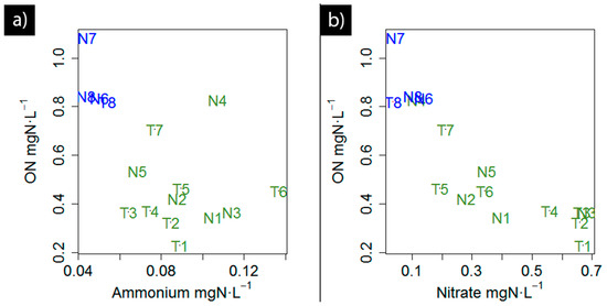 Scatterplot of (a) organic nitrogen versus ammonium and (b) organic nitrogen versus nitrate. The cluster “coast” is plotted in blue and the cluster “rivers” in green.