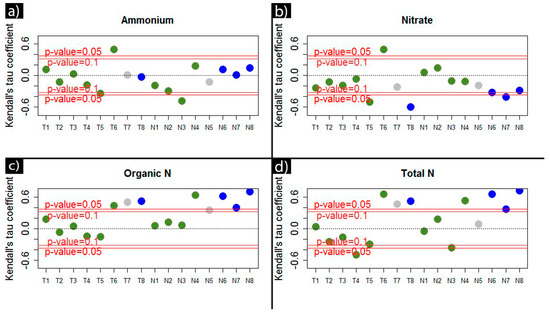 Kendall’s tau coefficient for (a) ammonium, (b) nitrate, (c) organic nitrogen and (d) total nitrogen in riverine (green), estuarine (grey) and coastal (blue) sites. Significant trend at a 90% and 95% confidence level are located above (increasing trend) or below (decreasing trend) the red lines.