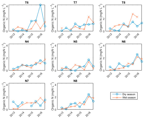 Additionally, the increases in organic nitrogen concentrations in coastal sites and the lower course of the Nautla and Tecolutla rivers were analyzed seasonally in Figure 6. T6 has an extreme value in the dry season which may be due to an unusual input of nitrogen, while N7 did not have an increasing trend in the dry season. Nonetheless, in most sites, an increasing trend appears in both the dry and the wet season.