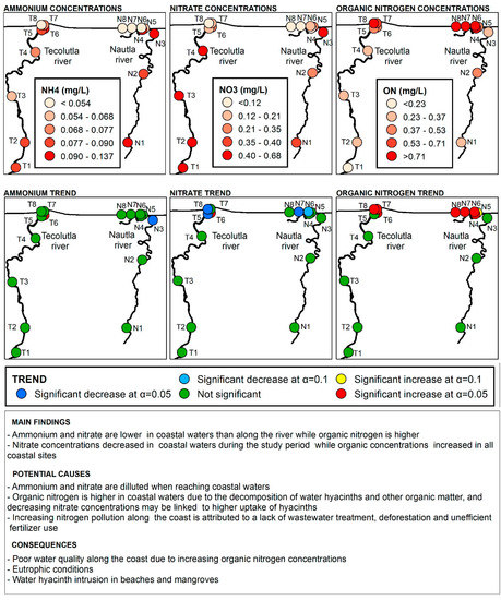 Despite the growing environmental damage in the Southern Gulf of Mexico, few studies [10,11,14] have addressed nitrogen pollution and its consequences. This study evaluates the spatial and temporal variations of ammonium, nitrate and organic nitrogen concentrations along two rivers and their coastal areas associated to mangroves where water hyacinth invasion is prevalent. The main objective was to determine whether nitrogen pollution or changes in N speciation may have occurred along the river and the coast and determine the possible sources and consequences for beaches and mangroves. The results can be extrapolated to other regions of the Southern Gulf of Mexico with similar characteristics.