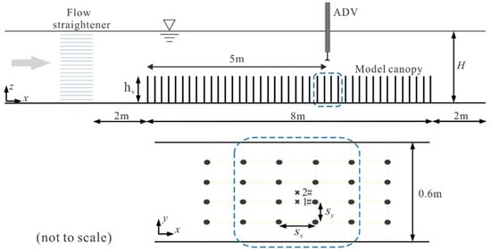 Laboratory experiments were conducted in a 12-m-long, 60-cm-wide (B = 60 cm), 60-cm-deep recirculating flume (Figure 1). An ultrasonic flow meter (Krohne, Germany) with an accuracy of 0.001 L/s was used to monitor flow discharge Q, which was maintained constant by a variable frequency pump system. The flow from the water tank passed through a flow-straightener upstream of the vegetation section to smooth the inflow. A tailgate was mounted at the outlet of the flume to control the flow depth H in the experiment. The bed slope was adjustable to create longitudinally uniform flow, which was judged according to the flow depths measured along the streamwise direction. Flow depth was measured by rulers with an accuracy of 0.5 mm placed on the glass sidewall at a spacing of 1 m.