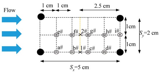 Velocity profiles at another 9 locations (from location a# to location i# in Figure 2) in flow field for Case V were measured additionally to study spatial variations of the flow characteristics and the representative locations of the canopy flow. The 9 locations were distributed evenly and fully within the bed area of Sx × Sy It is, thus, believed the spatial averages of the experimental data at these 9 locations can represent the overall flow. A comparison between the averaged velocity at the 9 locations and the averaged velocity at points 1# and 2# was conducted to verify that the measurements for points 1# & 2# are indeed representative.
