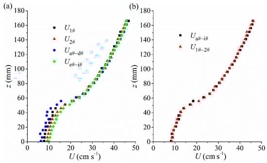 (a) Spatial variations of the velocity profiles and (b) the comparison between U1#~2# profile and the Ua#~i# one in Case V.