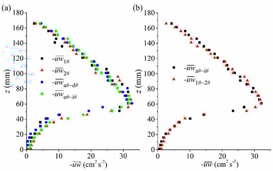 Figure 3 and Figure 4 compare the velocity profiles and the Reynolds stress distributions at different locations for Case V. The values characterized with subscripts of “a#~i#”, “1#~2#”, “a#~d#” and “e#~i#” denote the space-averaged values from location a# to i#, 1# to 2#, a# to d# and e# to i#, respectively. Therefore, Ua#~i# and represent the overall space-averaged flow characteristics in the experiment.