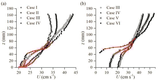 U profiles with different vegetation densities, (a) from Case I to Case IV and (b) from Case III to Case VI.