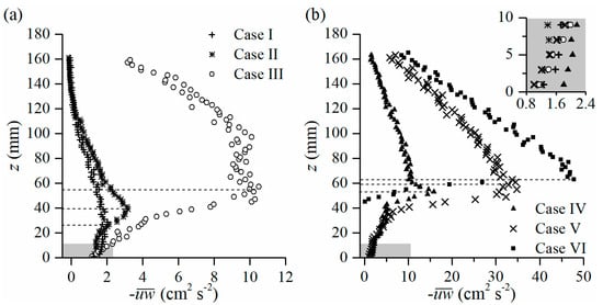 The Reynolds shear stress increases along z in a certain region near the bed and then decreases towards the free surface for all the cases (Figure 6). For Cases I & II (bed-shear flow), the shear stress attains its peak at z = (0.15~0.2) H (Figure 6a), which is the upper boundary of the inner region [7]. The height of the peak for Case II (with vegetation) is higher than the one for Case I (with no vegetation) (Figure 6a). In Case V, the peak of appears at the canopy level z = hv (Figure 6b) and the free-shear flow happens because of flow discontinuity at the canopy top [10].