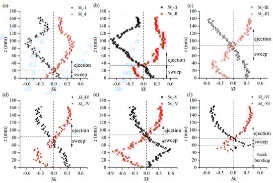 When it comes to Case VI, the Sku and Skw profiles above canopy (Figure 7f) are similar to those throughout depth in the bed-shear flow. Meanwhile, the ejection action is vertically fiercest near the free surface (Figure 7f), indicating that the sidewall effect disappears in Case VI.