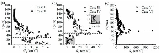 For Case I (bed-shear flow with no vegetation), GS decreases with z and its vertical maximum appears at the channel bottom. However, for Case II (the bed-shear flow with sparse vegetation), GS attains its peak both at the flume bottom and at a certain height above the bed (z = 31 mm). Meanwhile, GS in Case II is larger than that in Case I.