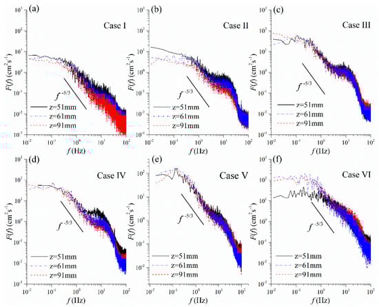For Case VI, the spectral curve fluctuates intensely within the low-frequency range. The curve at z = 61 mm nearly coincides with the one at z = 91 mm and is higher than the one at z = 51 mm. The height of z = 51 mm locates within the canopy, where the low speed porous media flow might happen in this dense vegetation condition with λ = 1.44.
