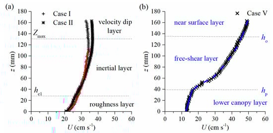 Case V is characterized with the free-shear flow, which could be divided into three layers as the lower canopy layer (0 < z < hp), the intermediate free-shear layer (hp < z< ho) and the surface layer (ho < z < H) [9]. hp and ho are the boundaries of the free-shear layer that could be estimated by the displacement height and the turbulent kinetic energy balance, respectively [19,20]. Experimental U data in the free-shear layer and the surface layer were fitted by the hyperbolic tangent function with R2 = 0.9986 and logarithmic function with R2 = 0.986 (see the blue dash line in Figure 10b), respectively. The U data in the lower canopy layer was compared with the power, exponential and logarithmic functions, of previous studies [17,18,21], separately. An exponential distribution law is satisfied in this region with R2 = 0.9328 (see Figure 10b).