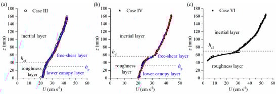 For flow at 0.04 < λ < 0.1, i.e., Cases III & IV in this study, the measured U profiles were mathematically fitted according to characteristics of the free-shear flow and bed-shear flow, separately. With consideration of the free-shear flow features, the coefficients of determination R2 = 0.9987 (Case III) and 0.9985 (Case IV) (hyperbolic tangent distribution law in the free-shear layer), and R2 = 0.8372 (Case III) and 0.8993 (Case IV) (exponential law in the lower canopy layer) (see the blue lines in Figure 11a,b). We find that U profiles throughout the region above canopy could be described by the hyperbolic tangent law. Therefore, one could assume that the free-shear layer is unconfined and the surface layer “disappears” in these cases.