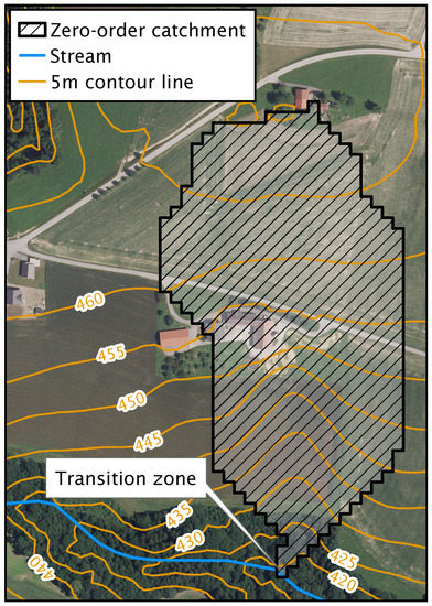 Example of a zero-order catchment (catchment area belonging to a single overland-channel transition zone) based on a DEM with resolution and the D8 single flow direction algorithm [41].