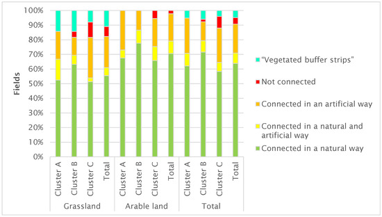 Among the mapped clusters and agricultural land use types, the minimum share of fields connected in a natural way is about 50 and the maximum about 75%, whereas fields connected in an artificial way constitute approximately 10 to 30% (Figure 4). The proportion of fields showing both attributes lies between roughly 5 and 15% and fields not connected at all exhibit a minimum share of 0 and a maximum of about 10%.