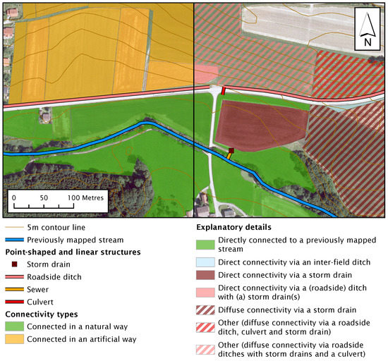 For this mapping key, the direct connectivity type was extended to include not only channels and gullies but also ditches, culverts, storm drains and sewers. Direct connectivity was furthermore split into known and unknown direct connectivity in order to differentiate between areas connected to an existing (e.g., governmental mapped) stream network dataset and areas connected to the actual stream network via features unknown to such a dataset (cf. [33]). The term diffuse connectivity was kept as it is.