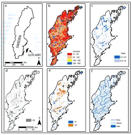 GIS maps and results from GIS analysis to identify areas with potential for MAR. (a) Map of Sweden and location of Island of Gotland. (b) Groundwater storage capacity (mm/year) []; (c) Ratio of groundwater recharge/storage capacity; only values below 1.0 are shown (GS); (d) Closed depressions (>1 ha) in the bedrock with no contact with the Baltic Sea (CD); (e) Areas from the lithological 3D model, blue: areas >4 m sand and/or gravel (IA) suitable for infiltration, red areas >4 m till and/or clay (ST) suitable for construction of surface storage dams; (f) Surface waters, i.e., raw water source (S).