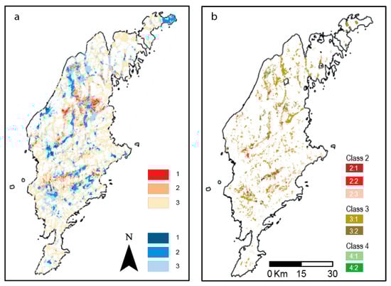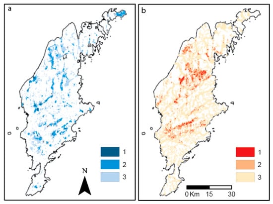Three data sets regarding the possibility for an area to be suitable for artificial groundwater recharge were combined into a raster set (Figure 2a). The resulting raster was divided into three classes: areas with three (class 1), two (class 2) or one (class 3) of the included favorable attributes. A raster with class 1 has a good potential for both infiltration and groundwater storage. Areas with class 2 or 3 are less suitable because one or two of the included raster sets (IA, GS, CD) is absent. Class 1 is present in 2068 ha (0.7% of Gotland), class 2 in 14,437 ha (4.8% of Gotland), and class 3 in 43,453 ha (14.4% of Gotland).