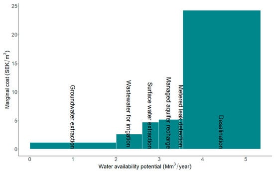 Figure 4 shows a marginal abatement cost curve for the analyzed measures, in which each measure is represented by a bar showing its unit cost (bar height) and annual water availability potential (bar width). As displayed, increased groundwater extraction and desalination had the largest potentials to improve water availability on Gotland. The water availability potential of desalination can be much larger, but the calculations here were based on assumptions of one new desalination plant. Increased groundwater extraction was associated with the lowest costs per cubic meter water provided, whereas desalination was associated with the highest unit costs. One reason for the high unit cost of desalination was the long pipelines needed to reach demand centers. In this comparative analysis, MAR was limited to groundwater recharge in the municipality’s existing well fields. Hence, the water availability potential of MAR on Gotland may be significantly higher when not constraining the analysis to those areas. The unit cost of MAR in existing well fields on Gotland was in the same range as that for increased surface water extraction.