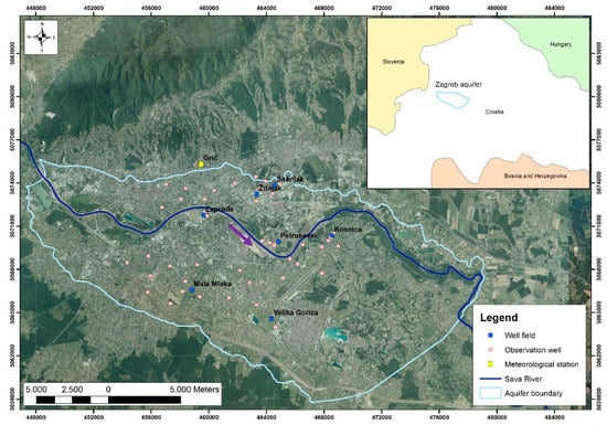 The Zagreb aquifer covers approximately 300 km2 and is located in the northwestern part of the Republic of Croatia (Figure 1). It presents the only source of potable water for approximately one million inhabitants of the City of Zagreb and part of the Zagreb County. The municipal water supply relies on the groundwater from the aquifer, which is abstracted at six currently operating well fields. During longer dry periods, smaller well fields located within the urban part of the City of Zagreb, which are usually not used by the water supply system, are put into operation. Total annual abstraction at Zagreb well fields in some years exceeds the annual groundwater recharge [21].
