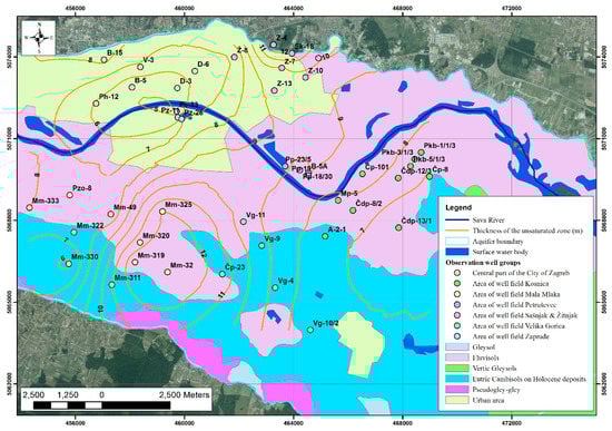 In addition to the isotopic data, different hydrogeological and pedological data were used. The Zagreb aquifer is of the unconfined type, and it is essential to determine the fluctuation of the groundwater table in order to determine the thickness of the unsaturated zone. Analysis of the minimum and maximum groundwater levels were done for the period from 2000 to 2014. The groundwater levels are measured continuously on one-third of the observation wells, but because the only purpose of many observation wells is water quality monitoring, they are not continually monitored. For these objects, maximum and minimum groundwater level data were taken from the water table contour maps created for wet and dry periods (Figure 3) [47]. In Table 1, groundwater levels for low and high waters characteristic for the area of each investigated observation well are shown. The difference between maximum and minimum groundwater levels varied from 0.8 to 5.09 m. Due to a large difference in the fluctuation of the groundwater level at certain points, only minimum groundwater levels, i.e., the maximum thickness of the unsaturated zone, were observed (Figure 2).