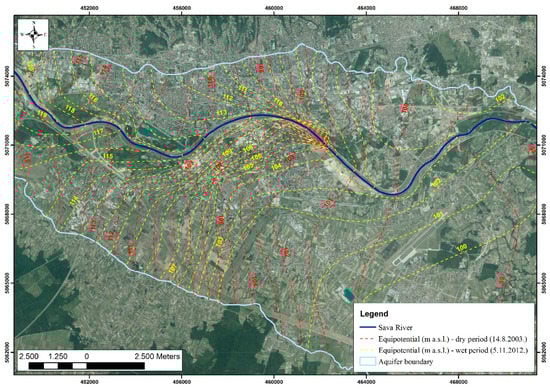 The water table contour map of the Zagreb aquifer during dry and wet periods (equipotentials in meters above sea level (m a.s.l.)) [47].