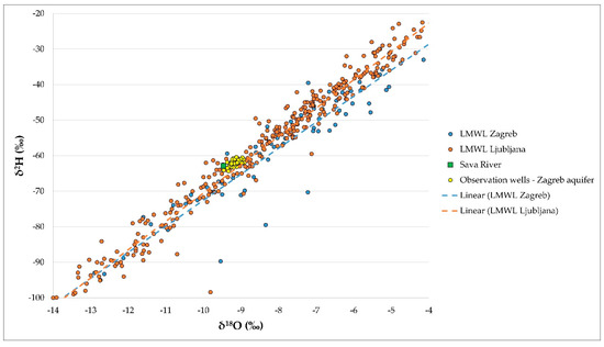 The local meteoric water line (LMWL) for Zagreb is given in Figure 4, together with the LMWL for Ljubljana (because the Sava River is formed by the Sava Dolinka and the Sava Bohinjka headwaters in northwest Slovenia) as well as the average values of the observation wells and the Sava River. The water isotopic composition of the Sava River and groundwater from the Zagreb aquifer is more similar to the precipitation in the area of the City of Ljubljana than the precipitation in the area of the City of Zagreb, which is in agreement with previous results [10,11,12,13,38].