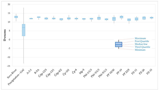 The d-excess values for groundwater were analyzed only for observation wells with at least 12 data measurements. The chosen objects are spatially representative for the entire aquifer and statistically more reliable. The d-excess values in groundwater samples varied from 9.07‰ to 14.21‰, while they varied from 10.49‰ to 14.69‰ in samples of the Sava River. Deuterium excess values in samples of the local precipitation varied a wide range from −13.38‰ to 18.18‰ (Figure 5). Groundwater and river water had similar isotopic signature as opposed to local precipitation.