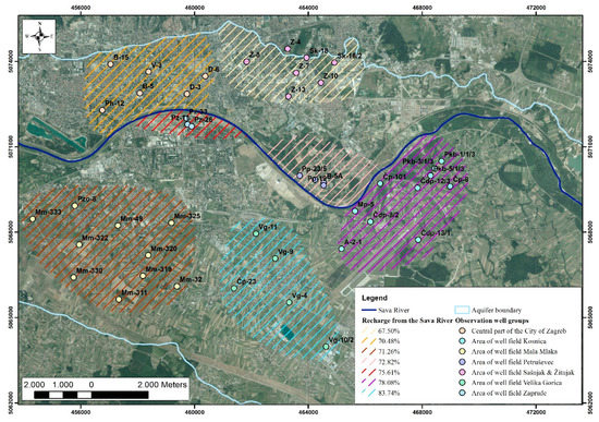 Of all the 45 observation wells, 21 are located in the Fluvisols, eight of them in the Eutric Cambisols, and 16 in the urban area (Figure 2, Table 5). Most of them are located on the right bank of the Sava River. Although the observation wells located in the Fluvisols are closer to the Sava River, they show about 6% lower influence of the Sava River on the recharge of the Zagreb aquifer, which is probably the result of a more permeable soil type (Table 5). In the Eutric Cambisols, a higher fraction of finer particles, i.e., silts and clays, can be found, which reduces the amount of infiltration through the unsaturated zone into the Zagreb aquifer.