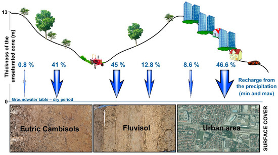 The thickness ranges in different types of soil were very similar. The thickness of the unsaturated zone varied from 5.7 to 11.5 m within the Eutric Cambisols soil type, from 6.1 to 12.9 m within the Fluvisols, and from 5 to 13 m within the urban part of the Zagreb aquifer. However, the minimum and maximum values of the precipitation fractions in the Zagreb aquifer recharge, calculated based on the data from the observation wells in different types of surface cover (Table 3), showed the importance of observing the characteristics of an unsaturated zone and its role in the estimation of groundwater recharge. Figure 7 illustrates how the soil type and thickness of the unsaturated zone affect the recharge of the aquifer from precipitation. The Eutric Cambisols soil type is less permeable than the Fluvisol and, combined with the large thickness, it results in extremely low infiltration of precipitation. Similarly, in spite of the greater permeability of the Fluvisols, large thickness of the unsaturated zone significantly reduces infiltration from the surface. However, detailed inspection of soil permeability should be done in future research. In the urban area, the soil and the unsaturated zone are mostly disturbed, making it difficult to interpret the results. The occurrence of low and high values of recharge from precipitation confirms emphasized heterogeneity caused by human activity in that area.