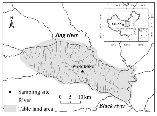 This study was conducted in Changwu County (35°12.701′ N to 35°16.717′ N), Shaanxi Province, China (Figure 1). All sampling sites were located on flat tableland with elevations of around 1200 m above sea level. The climate is semi-humid with an annual precipitation of 580 mm, 70% of which falls from June to September [33]. Rainfed agriculture is the dominant production system. However, since the 1980s, apple trees were widely planted. By 2000, apple orchards covered 60% of the arable land in Changwu County [34]. As one of the first areas in China to grow apples extensively, old apple orchards were found facing low soil water content in deep soil layers, and some of them have been cut down in recent years due to poor productivity. Therefore, this area is ideal for studying the movement of soil water following deforestation.