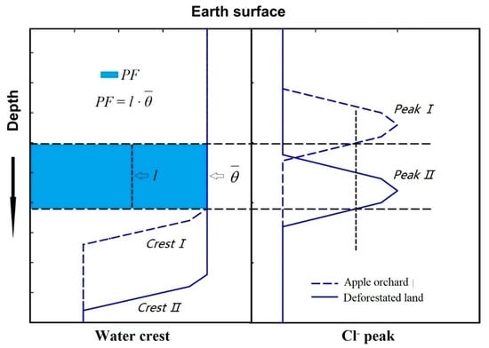 At the initial stage after deforestation, deep soil is desiccated and therefore nearly all the water and Cl− are concentrated in small pores. During the recovery process, the infiltration water (“newer” water) should be in pores larger than the “older” water filled pores (with high Cl− concentrations). As large pores are normally featured with a fast water flow velocity, herein, we use the downward migration of Cl− to represent piston flow, and the water moving faster than Cl− to derive preferential flow (Figure 2). In this process, the deforested site had the same Cl− input time as the corresponding standing orchard. Considering that multiple Cl− fronts will be formed due to the unstable input of Cl− in the orchard, we took the midpoint of the lowest dispersion front as the reference point to calculate the Cl− migration distance. The piston flow amount (cm) was calculated according to the migration distance of the reference point: