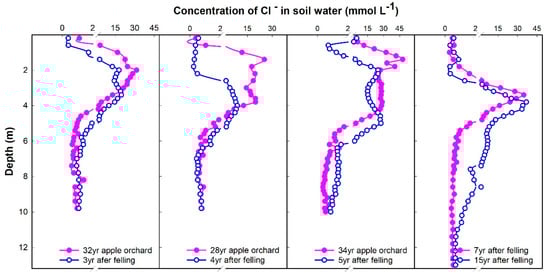 Unlike shallow-rooted plants, deep-rooted trees are normally characterized by high water demand [18]. This stimulates trees to extract more water in deep soil [19,20], and finally results in the desiccation of deep soil, which occurs in both arid and humid regions [18,21,22,23,24,25,26]. Moreover, in water limited environments, the desiccated deep soil can hardly be replenished during the life span of the trees [16]. Consequently, trees are likely to experience more water stress, and are more vulnerable to disease, eventually leading to disease-induced death or being felled (deforestation) due to poor productivity. Moreover, in soil of a felled forest, the upper several meters of the soil profile normally contain higher Cl−, due to, for example, the intensive application of chemical fertilizers, which is especially the case in the Loess Plateau [2].