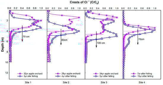 In all the measured profiles, there were large Cl− concentration peaks (Figure 3) with Cl− concentration ranging from 9 to 48 mmol L−1 (Figure 3). In some profiles, more than one peak appeared, which may be attributed to unstable fertilization after afforestation. The Cl− concentration stabilized below the crest area, with concentrations ranging from 0.25 to 1.43 mmol L−1, which was far less than in the above strata. Moreover, in all paired sites, the shape of the Cl− profile was almost the same between the recovering site and the standing orchard. This result demonstrated that in each paired site, spatial variability was quiet small, and therefore, the appeared difference between the Cl− peak and soil water can be used to investigate water flow mechanisms in deep soil.