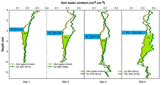 It takes a long time to directly observe the water migration process since deforestation. Instead, the space-for-time substitution method [35] was used in this study to detect the long-term water flow mechanisms in deep soil. Compared with the standing orchard, soil water changes in the deforested sites were used to investigate the long-term water movement in deep soil. In this context, the total replenishment of depleted soil water storage (TR, cm) was calculated by: