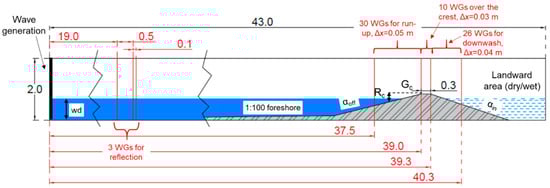- Thirty and 26 wgs were placed, respectively, on the off-shore slope (between 37.5 and 39 m from the wave generator, interspaced with a uniform interval of Δx = 0.05 m) and on the in-shore slope (from 39.3 to 40.3 m, with Δx = 0.04 m); these gauges were installed for analyzing the wave run-up and the wave overtopping and calculating the wave transmission coefficient;
