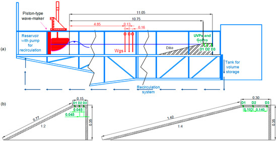 As shown in Figure 2a, the wave-flume was equipped with the following instruments: