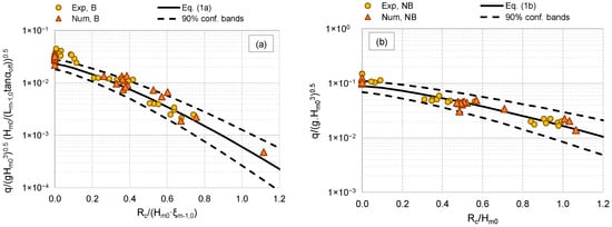 The new data of q are compared to the curves representing Equations (1a) and (1b) in Figure 3a,b, respectively. In both charts, the data are distinguished by numerical (triangles) and experimental (circles) tests and are plotted against the relative freeboard. The values of Rc/Hs were computed from the incident wave heights Hs, measured at the structural toe instead of the target values reported in Table 1 and Table 2. In both charts, only the tests at Rc/Hs ≥ 0 and dry landward conditions are plotted. On average, the data are straightly and symmetrically distributed around the [28] curves. Most of the data fall within the 90% confidence bands associated to the predicting formulae (dashed lines in Figure 3). The greatest scatter is observed around the zero freeboard, where the formulae seem to underestimate part of the numerical and experimental data. Quantitatively, the agreement among the data and Equations (1a) and (1b) is provided for both the numerical and the experimental data in Table 3 in terms of the error indexes R2 (coefficient of determination) and of σ% (relative standard deviation or coefficient of variation). Numerical data are significantly better predicted by Equations (1a) and (1b) than the experimental data, being σ% = 16% and R2 = 0.95 in case of the numerical dataset and σ% = 56% and R2 = 0.87 in case of the laboratory dataset. The lower agreement found for the experimental data is principally caused by the underestimation bias at Rc/Hs = 0, as it can be appreciated by Figure 3.
