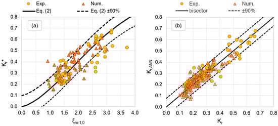 (a) Experimental and numerical values of Kr as functions of ξm−1,0 compared to the curve representing Equation (2) for the prediction of Kr. (b) Comparison among experimental and numerical values of Kr and corresponding predictions from the ANN. The dashed lines represent the 90% confidence bands associated to the formula and the ANN predictions.