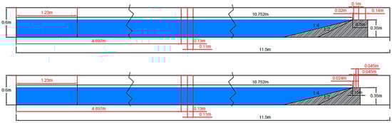 A specific numerical channel and an ad hoc mesh grid were set up to exactly reproduce the wave flume and the position of the wgs in the lab. The mesh resolution Δz was set constant across the numerical channel and equal to 0.004 m, while the horizontal mesh was made variable by keeping the finest grid of Δx = 0.004 m in the area around the structures. Six numerical wgs were set in accordance with the laboratory instruments; i.e., three of the resistive gauges for the separation of the incident and reflected wave heights (at around 5 m from the wave-maker) and three of the UVPs along the dike crests. The layout of the numerical channel and the displacement of the numerical gauges are shown in Figure 6. The reproduced dike configurations with G30 and G15 are respectively reported at the top and at the bottom of Figure 6.